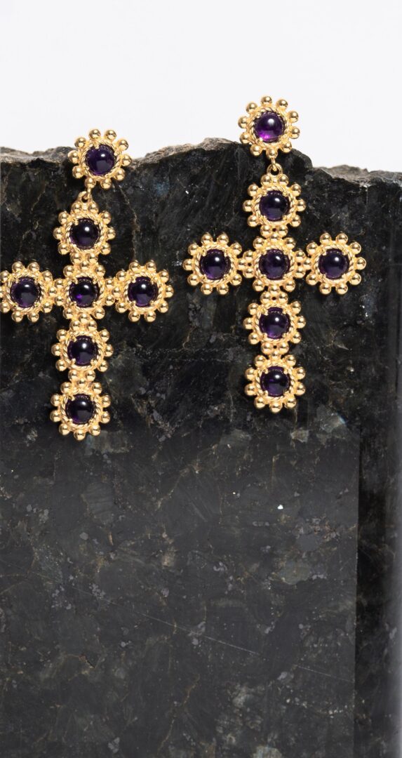 The handcrafted Agnes Earrings is a heavenly and ethereal. Combines positivity and imaginativeness. Dynamically balanced in gold and purple deep gem contrasts. Each and every necklace is unique and due to the use of semi precious stones because of variances in colour, shape and texture.