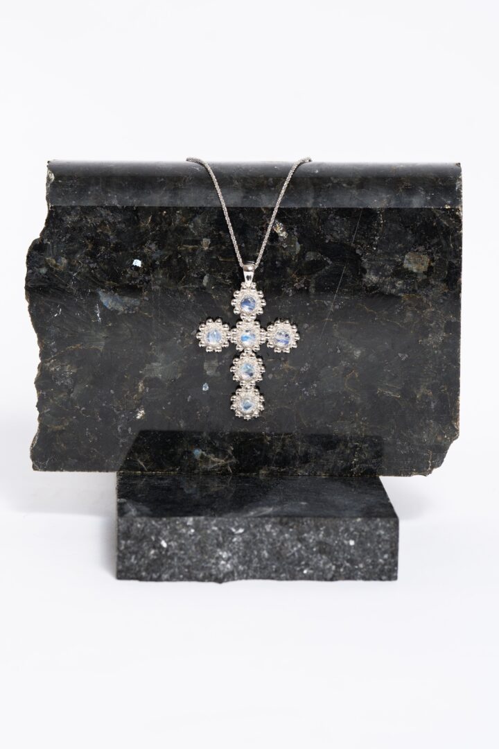 The handcrafted Agnes Necklace is a heavenly and ethereal. Combines positivity and imaginativeness. Dynamically balanced in silver and clear white gem contrasts. Each and every necklace is unique and due to the use of semi precious stones because of variances in colour, shape and texture.