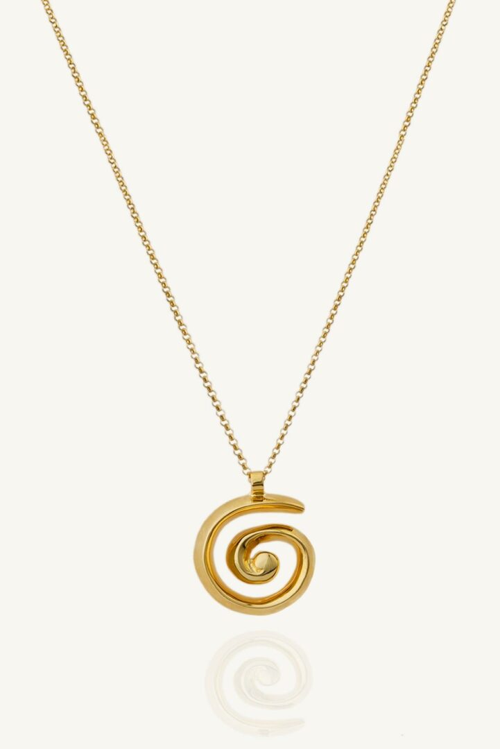 This exquisite necklace features a large handcrafted spiral pendant that demands attention with its bold presence. Adorned with a shiny chain, every detail of this piece is meticulously crafted to perfection.