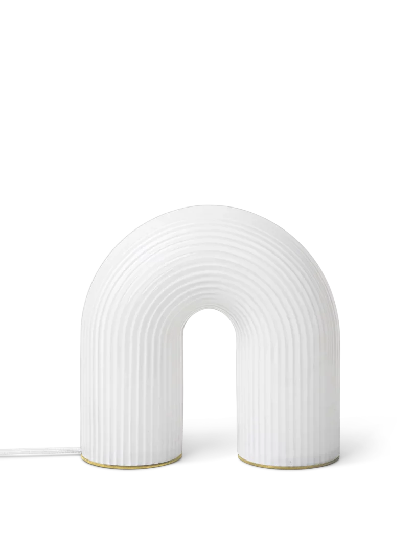 Vuelta lamp is made from opal glass with a rippled surface that lends textural appeal to the piece. Designed with an LED light source that emits a soft, diffused light, it also features an adjustable dimmer switch for ultimate ambiance control. Use it as a decorative lamp in a dark corner or on a shelf to light up a collection of books.