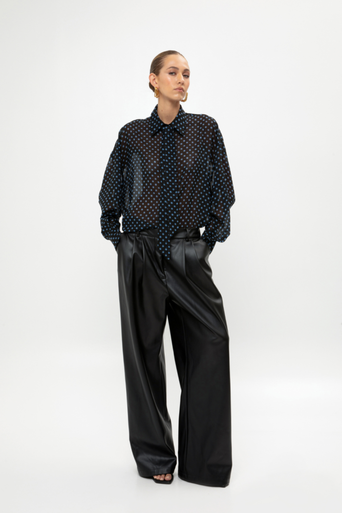 These sleek wide-leg faux leather pants are the ultimate blend of bold style and comfort. Featuring a high waist and tailored pleats, they offer a flattering silhouette while maintaining an edgy, modern vibe. Perfect for a night out or a sophisticated daytime look, these pants are a versatile wardrobe essential.
