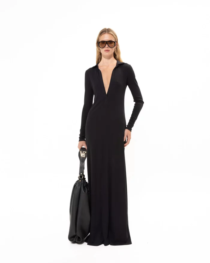 A sleek black ribbed maxi dress that combines timeless elegance with effortless comfort.