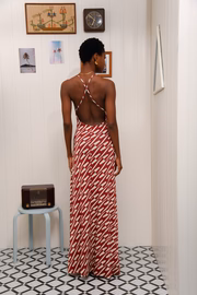 The Chill Island Maxi Dress features a draped neckline, open back with crisscross straps, and a floor-length flowy cut. Made from soft, stretchy fabric in a bold bordeaux and cream geometric print. Easy to wear and made to stand out.