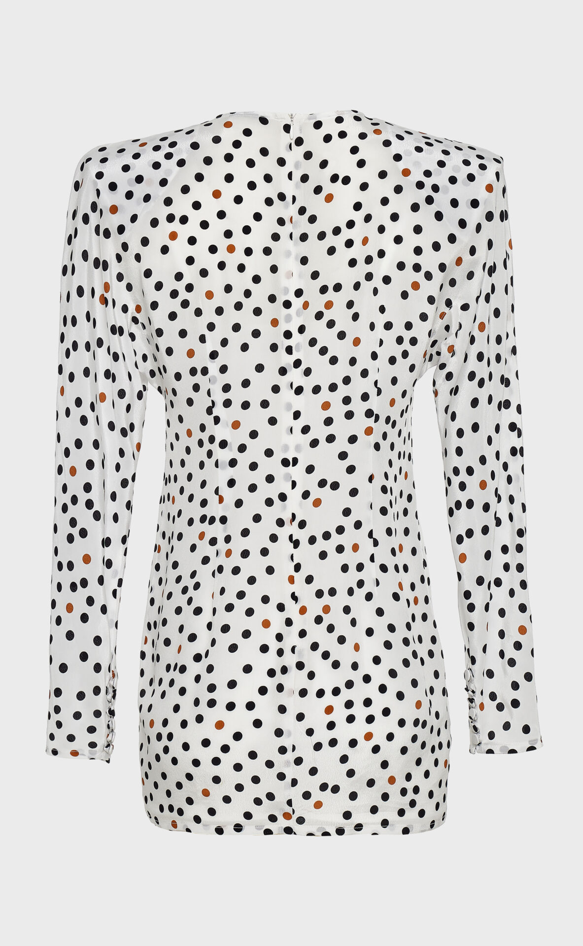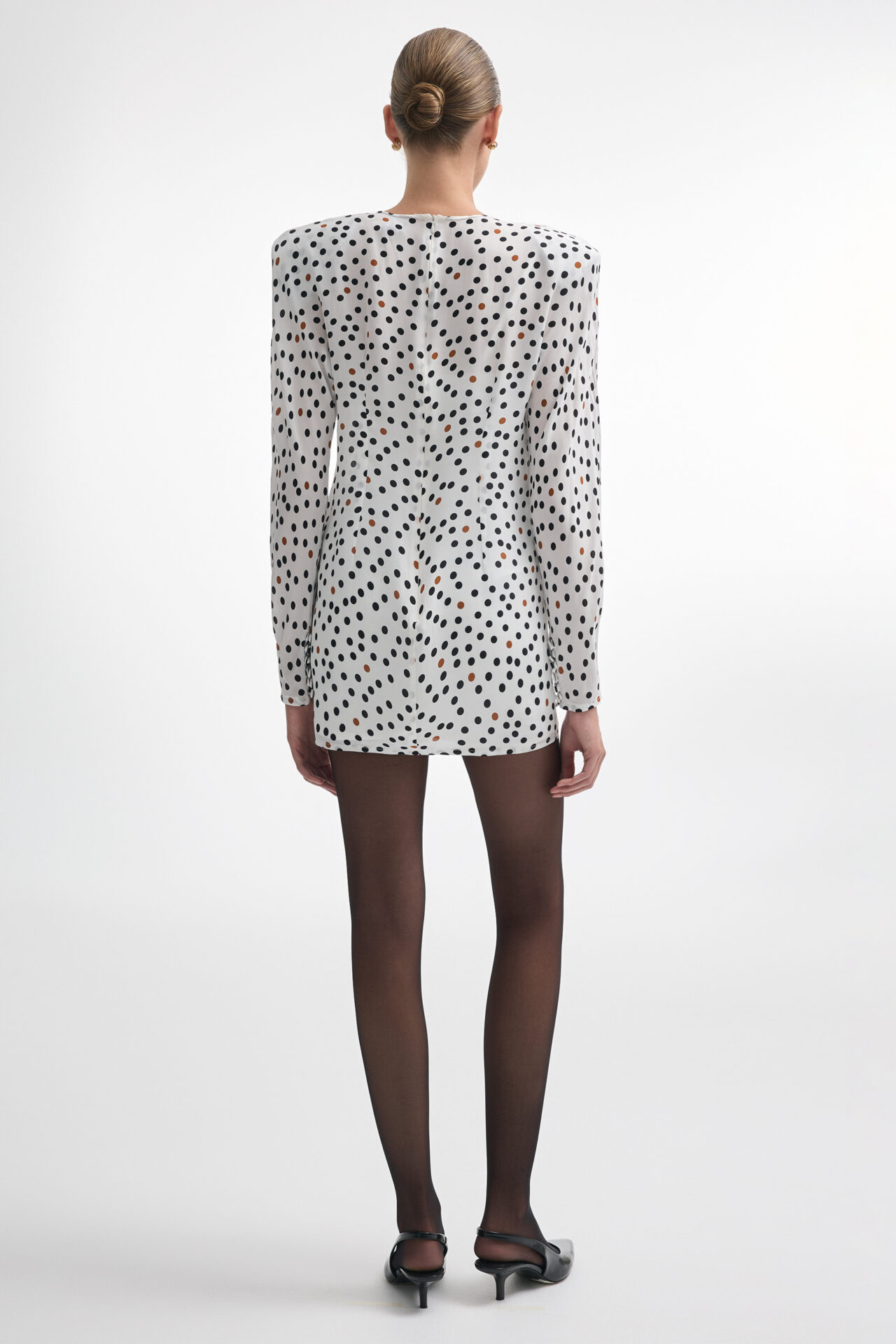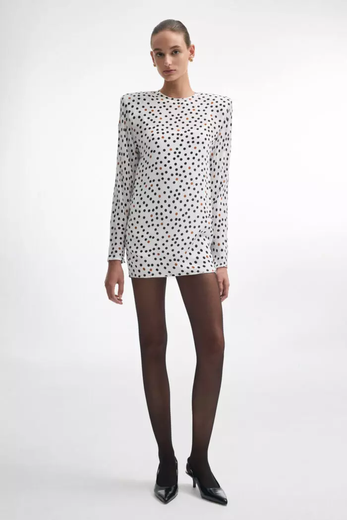 The Dot Com mini dress is playful and polished, with a fitted silhouette that flatters the body. With a lightweight fabric, long sleeves, and a high round neckline, it offers a clean and modern shape. The black and brown polka dot print adds a subtle retro note, while the mini length gives it a confident, contemporary edge. Pair it with boots for daytime or heels for an elevated evening look.