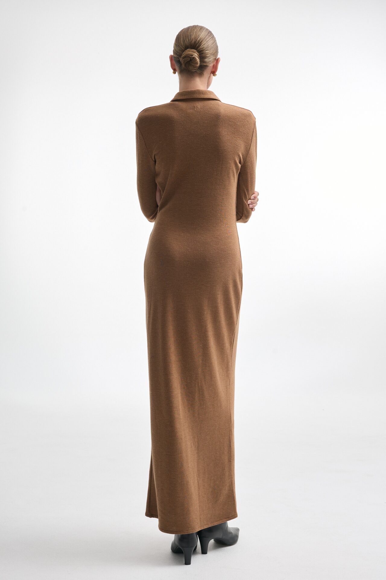 Elevate your wardrobe with this sleek maxi dress, designed to flatter your figure while keeping things chic. Featuring a polo-style collar with button detailing and long sleeves, it combines sophistication with modern minimalism. The soft, stretchy fabric hugs your curves for a comfortable yet polished look, making it perfect for both day and night.