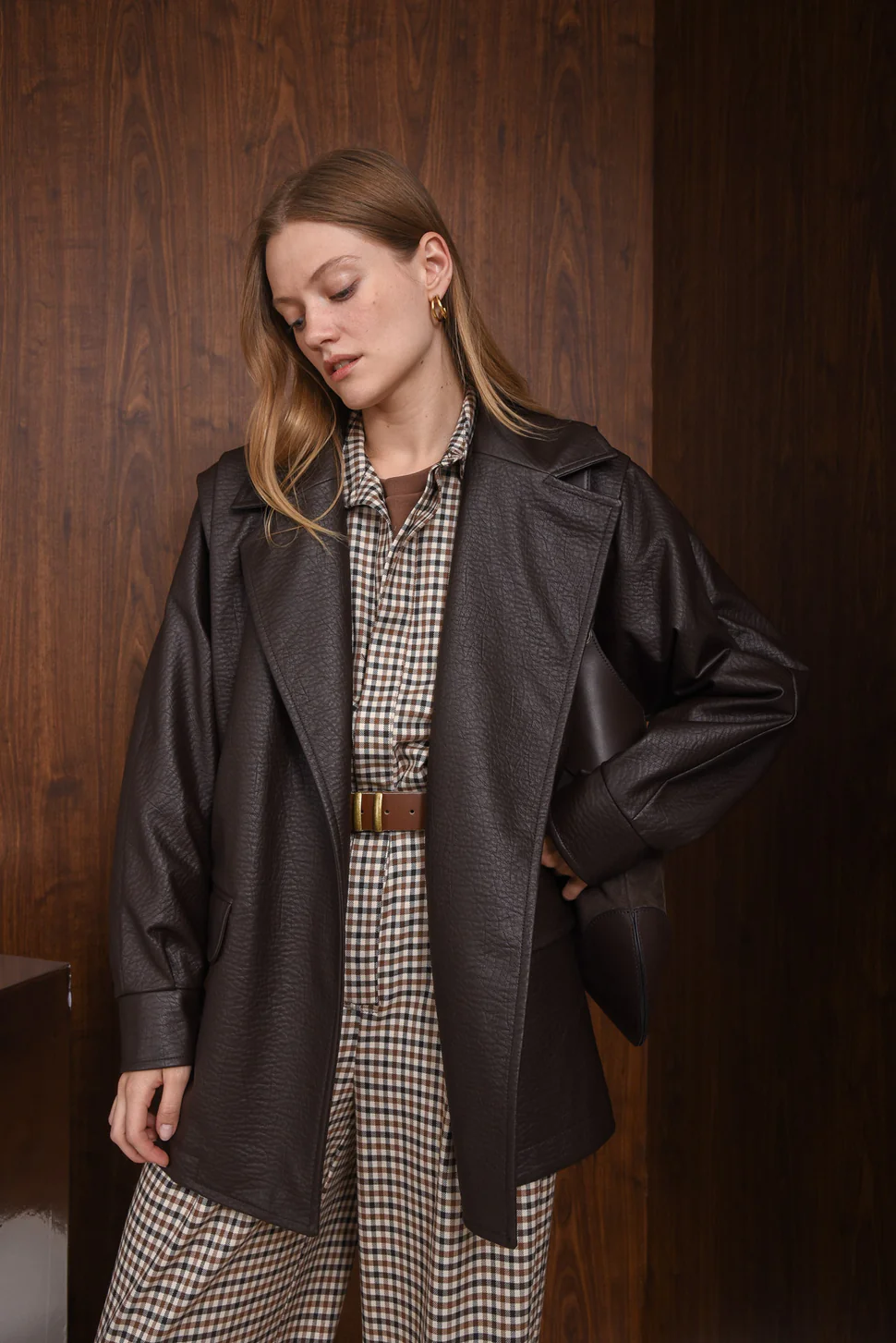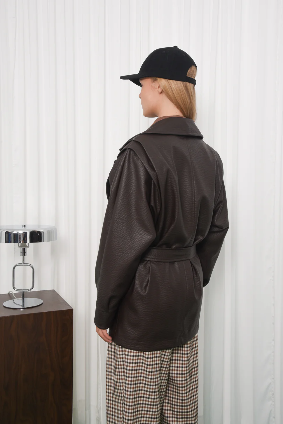 The Improve Jacket is crafted from soft faux leather with a natural matte grain texture. Designed in a relaxed, slightly oversized silhouette, it features a wide lapel collar, front flap pockets, and a matching belt with a metal buckle for a defined waist. Fully lined for comfort, it’s a modern take on a timeless wardrobe piece.