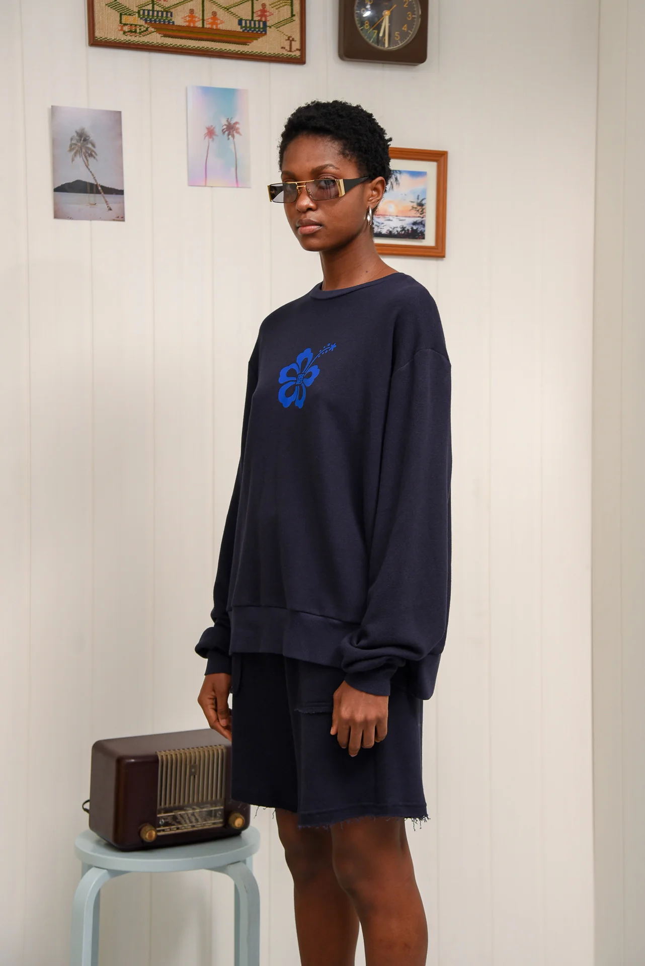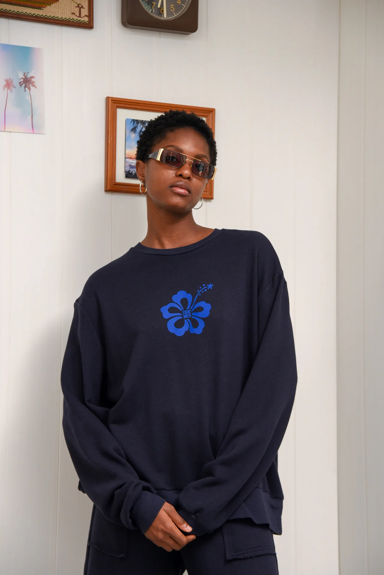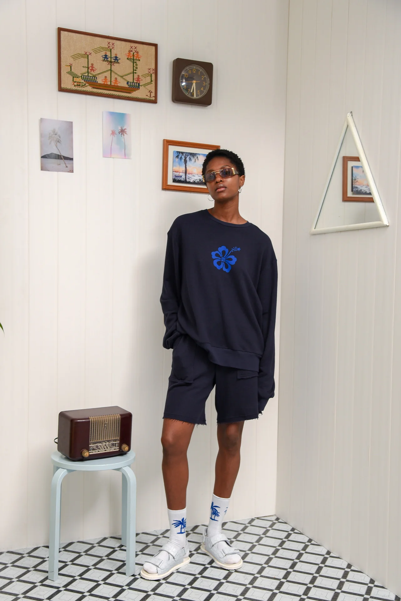 Upgrade your wardrobe with the Chili Sweatshirt in deep navy blue. Made from soft material, this oversized crewneck delivers comfort and effortless style. Featuring a bold blue hibiscus graphic on the chest, ribbed cuffs, and a relaxed fit, it’s perfect for casual days or layering up in style.