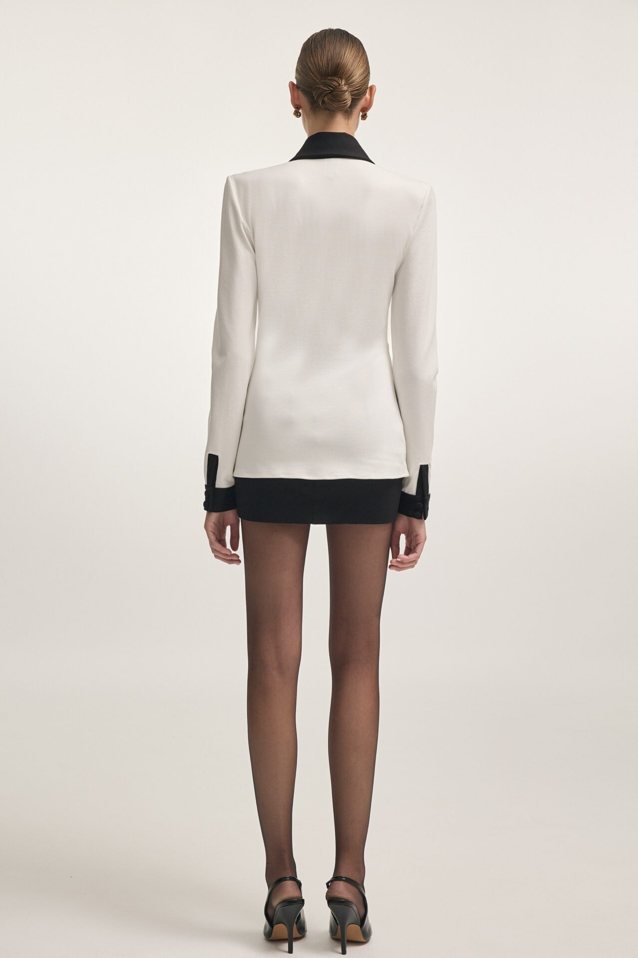 Tailored from soft jersey punto fabric, the Deadline Shirt redefines a classic silhouette through contrast and precision. The black collar, cuffs, and buttons frame its clean lines with quiet authority. Designed to sit close to the body, it balances structure and fluidity,an effortless piece for modern uniform dressing.