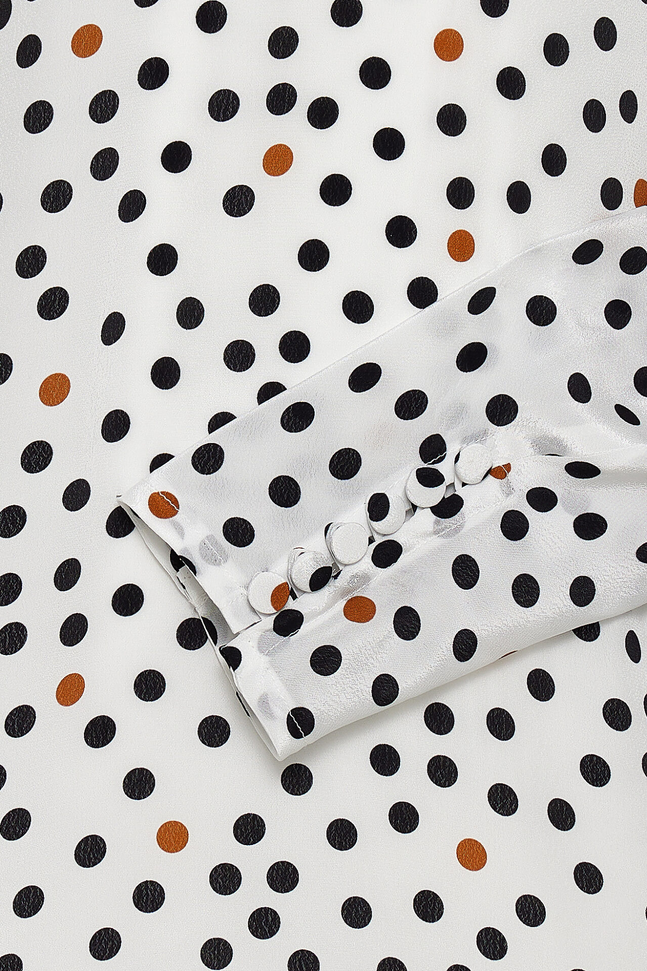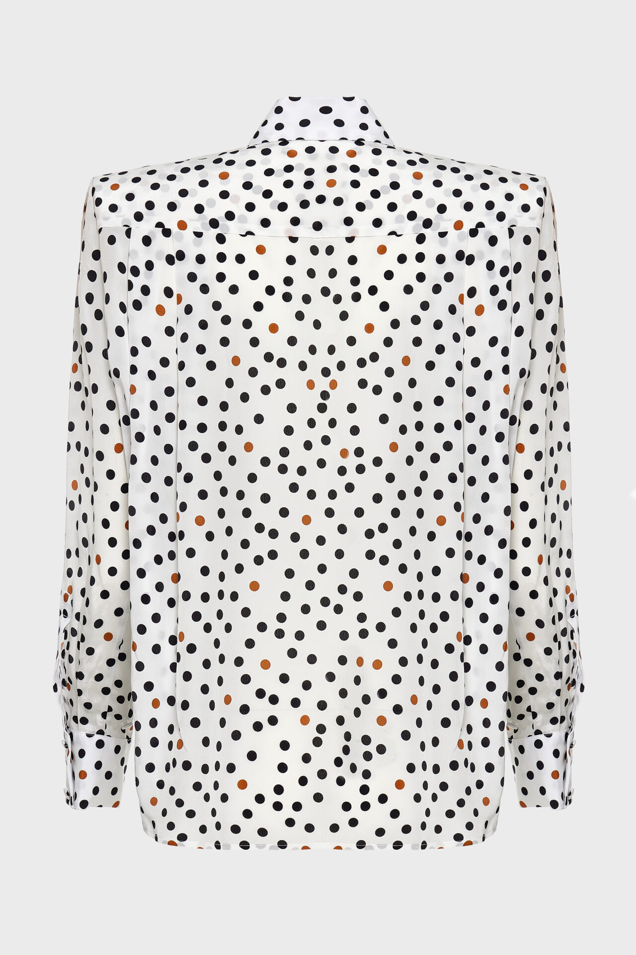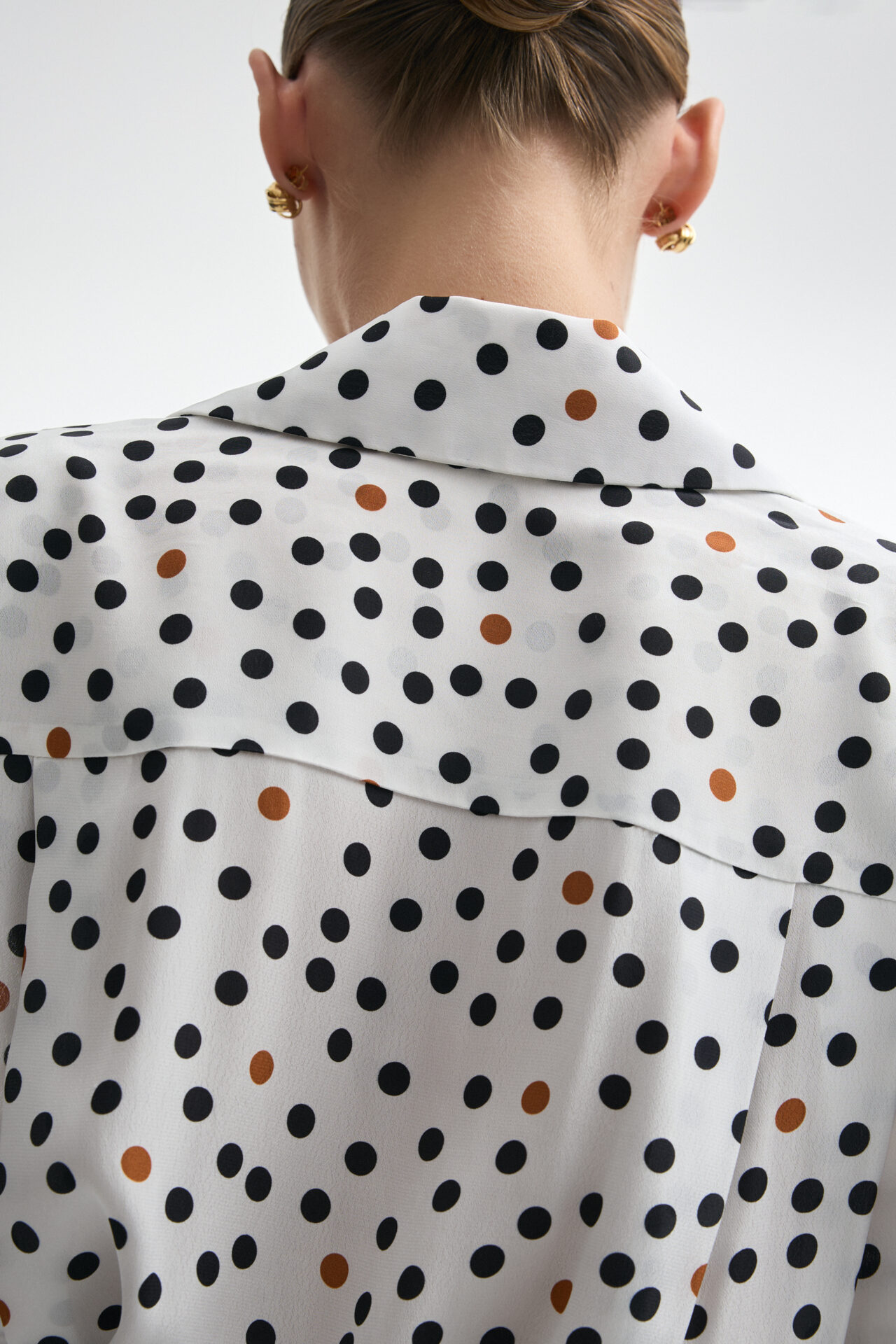 The Dot Com shirt brings a subtle mix of playfulness and polish to your wardrobe. Crafted from soft, fluid fabric, it features a classic collar, front buttons, and adjustable cuffs for a personalized fit. The black and brown polka dot print and the shoulder pads add a modern twist to a timeless silhouette, making it just as suited for the office as for relaxed weekend styling.