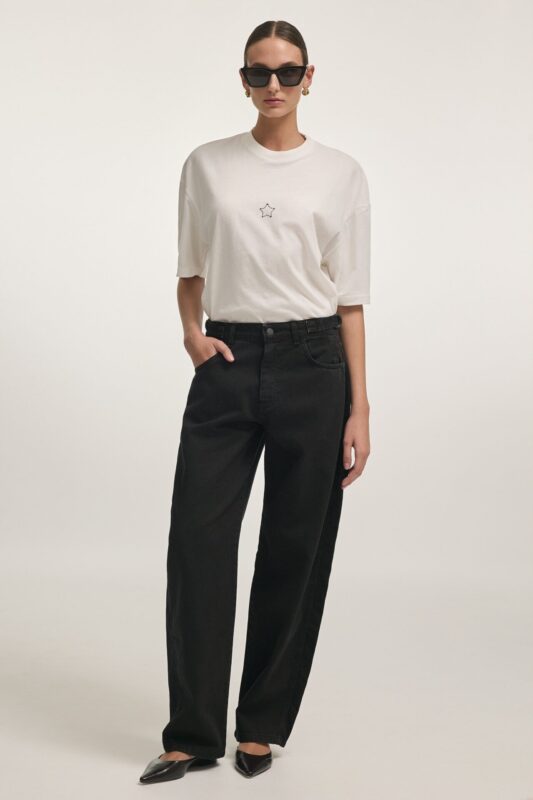 Cropped T-shirt made from soft, breathable cotton with a relaxed silhouette. Features a minimalist embroidered star detail at the front and a raw-cut hem for a modern finish. A versatile piece that pairs effortlessly with high-waisted trousers or denim for a laid-back yet elevated look.
