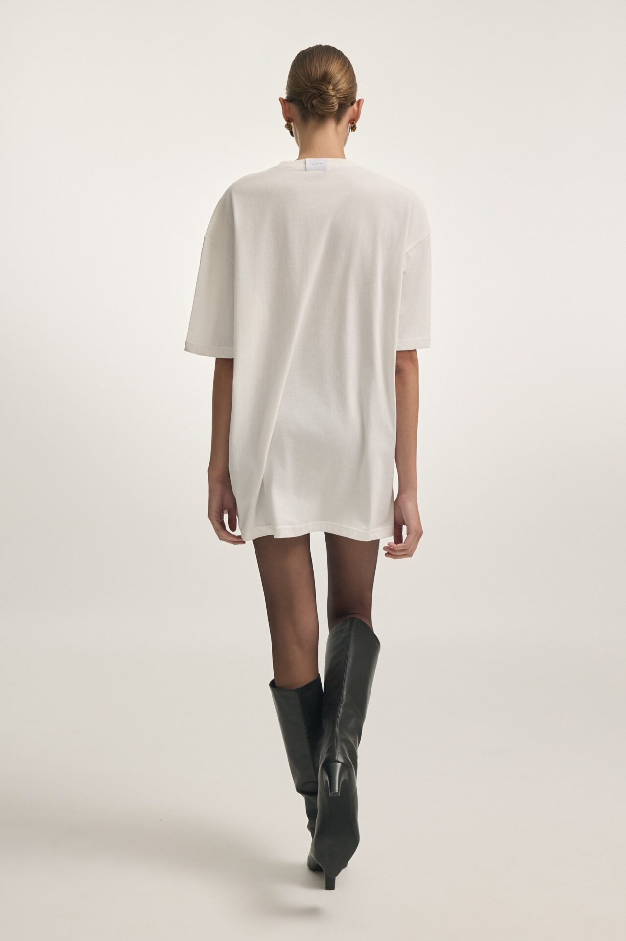 Relaxed oversized T-shirt crafted from soft, premium cotton for a smooth and breathable feel. Features a minimal design with signature embroidered details and a classic crew neckline. A timeless piece that combines effortless comfort with modern attitude perfect for layering or wearing on its own.