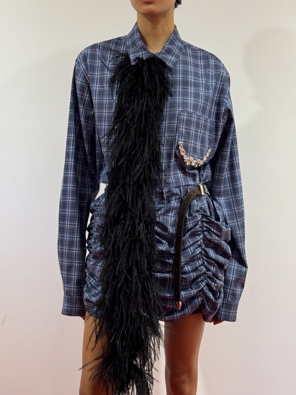 OVERSIZED SHIRT WITH CRYSTALS AND FEATHER