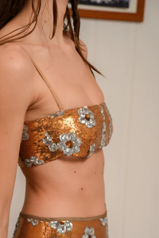 The Honeydew Mini Skirt is a short A-line skirt made with shiny gold sequins covered with silver sequin flowers all over. It has a smooth lining inside for comfort and a side zipper for easy wear. The waistband is soft and flat. This skirt is perfect to dress up for parties or fun summer days.