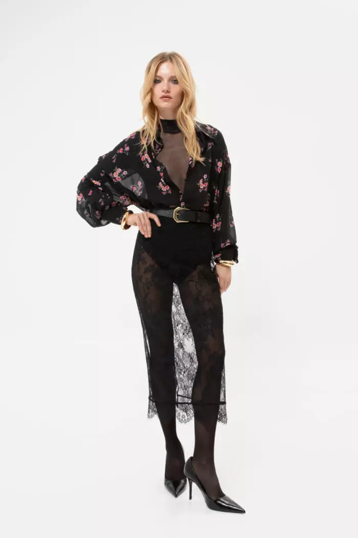 An elegant midi lace skirt that exudes sophistication with its intricate detailing and graceful silhouette. Can be worn independently or as an undergarment.