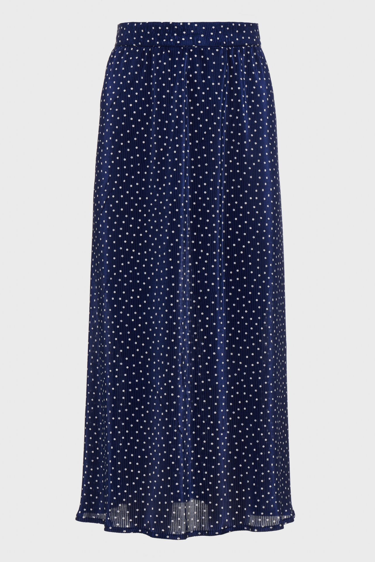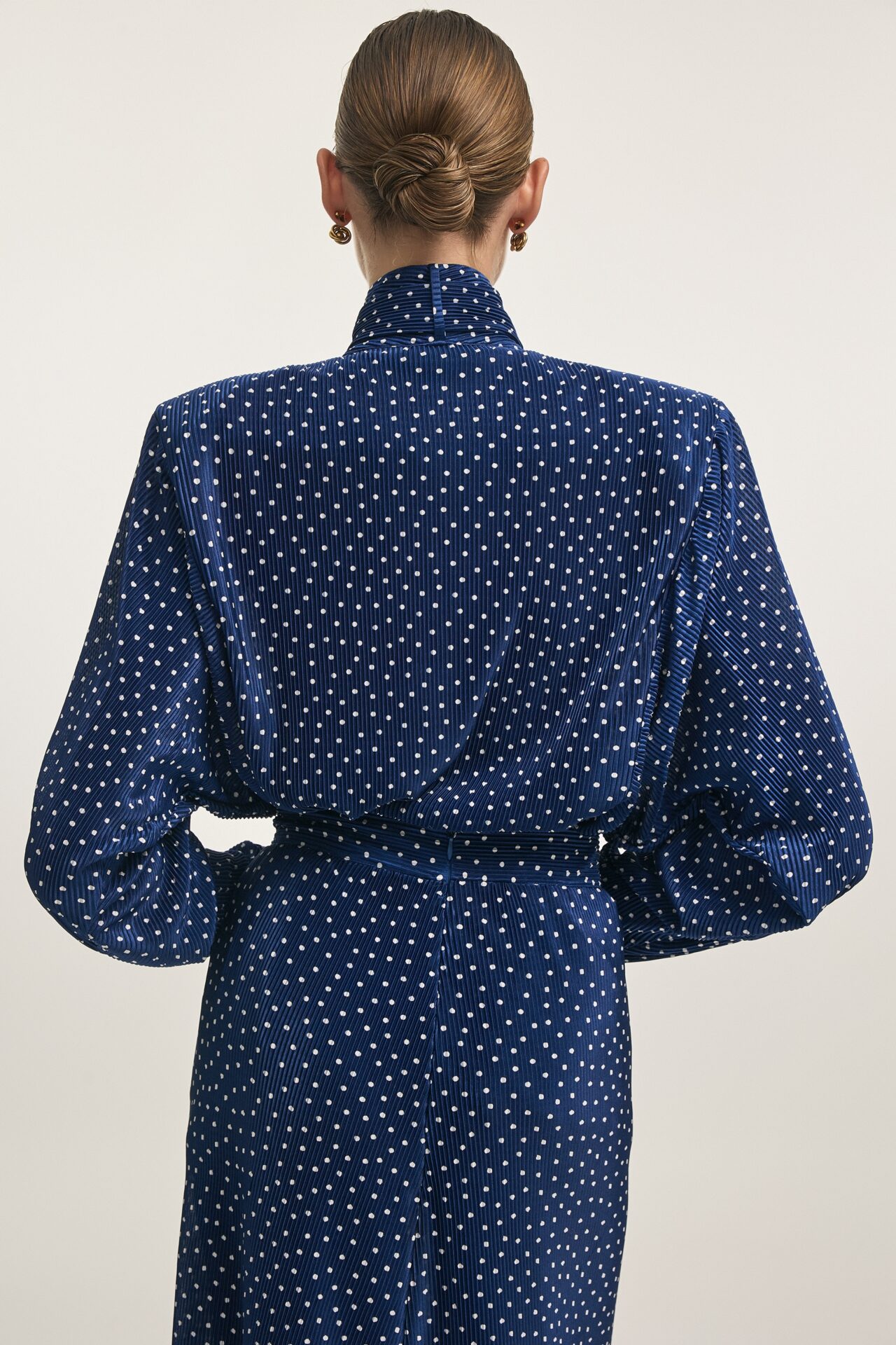 A fluid maxi skirt in pleated satin with a delicate polka-dot pattern. Designed to move with ease, it drapes gracefully around the body, capturing light with every step. The clean waistband and understated silhouette bring a sense of modern poise, an effortless balance of softness and structure.