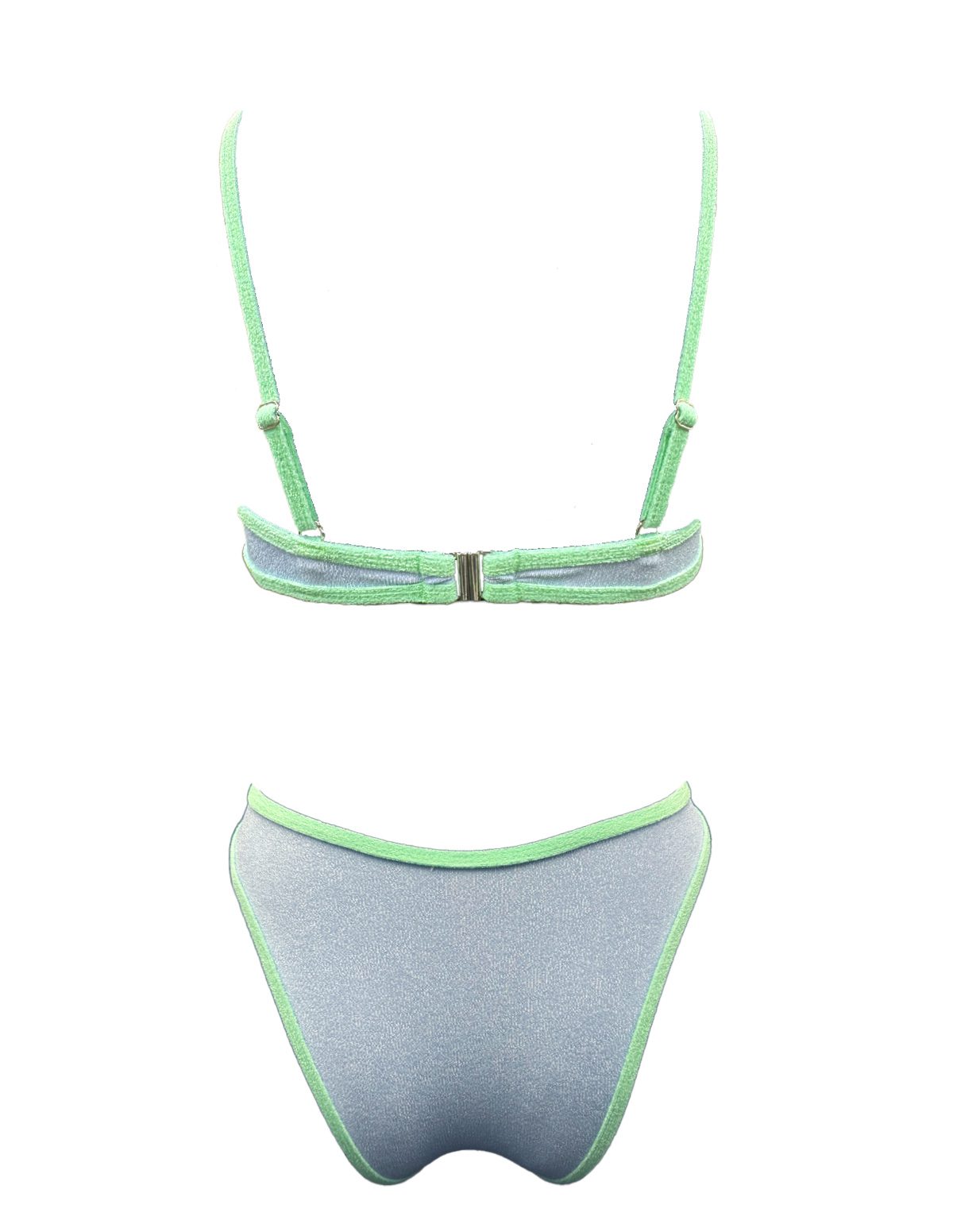 Scoop bikini top with adjustable shoulder straps and high rise bikini bottom.