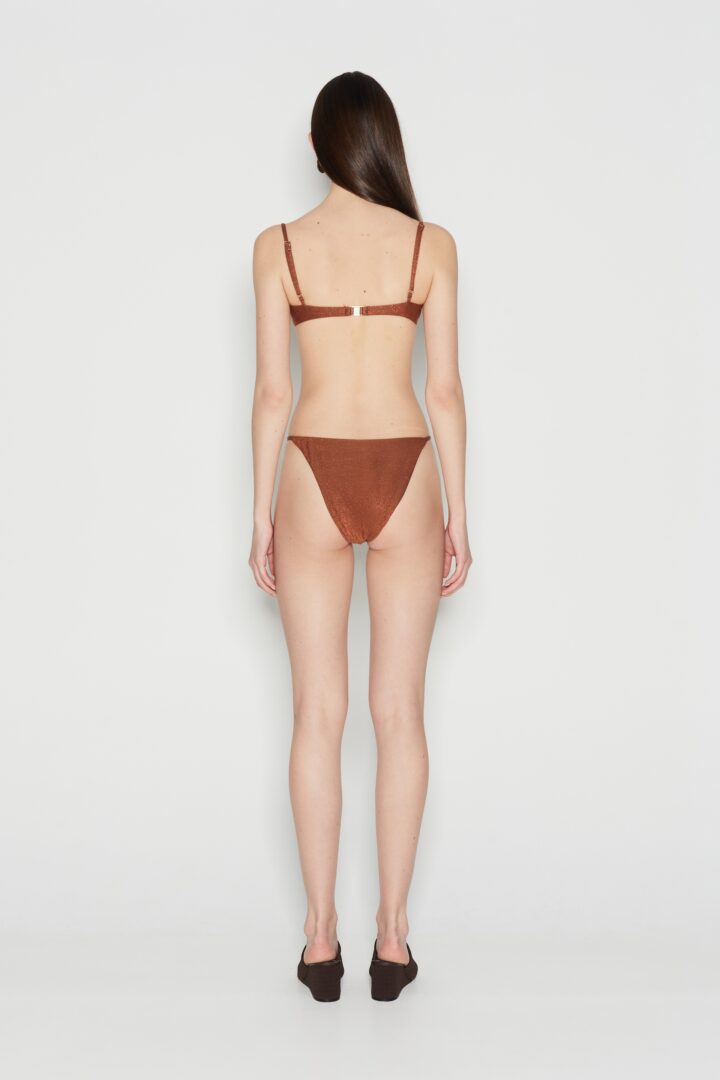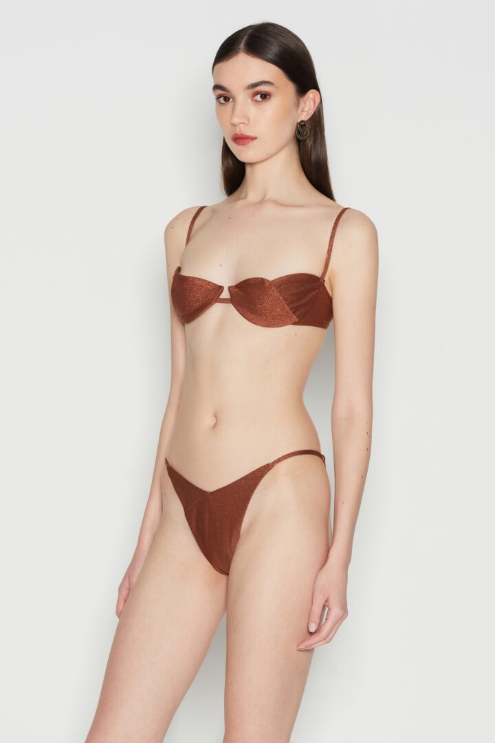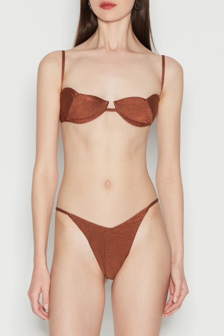 The Delmare Bikini is a timeless essential, crafted in Greece from stretch lurex fabric. Featuring underwired balconette cups and high-cut briefs, it offers both support and a flattering silhouette. Paired with a vibrant pareo or a caftan dress, this bikini promises enduring elegance for years to come.
