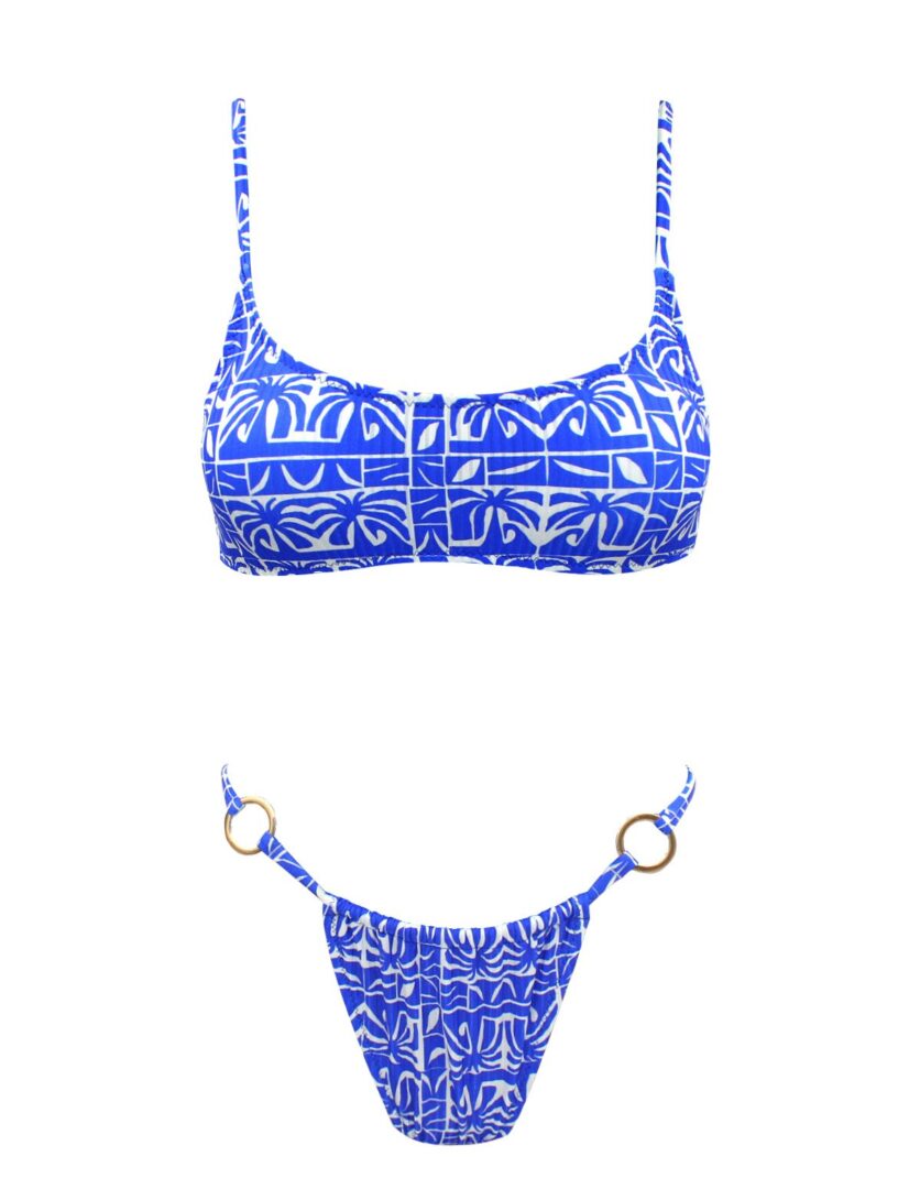 Scoop line crop bikini top with thin adjustable straps and ruched high-waist bikini bottom with thin straps and decorative golden ring accessory. Adjust bottom for as little or as much coverage as you want.