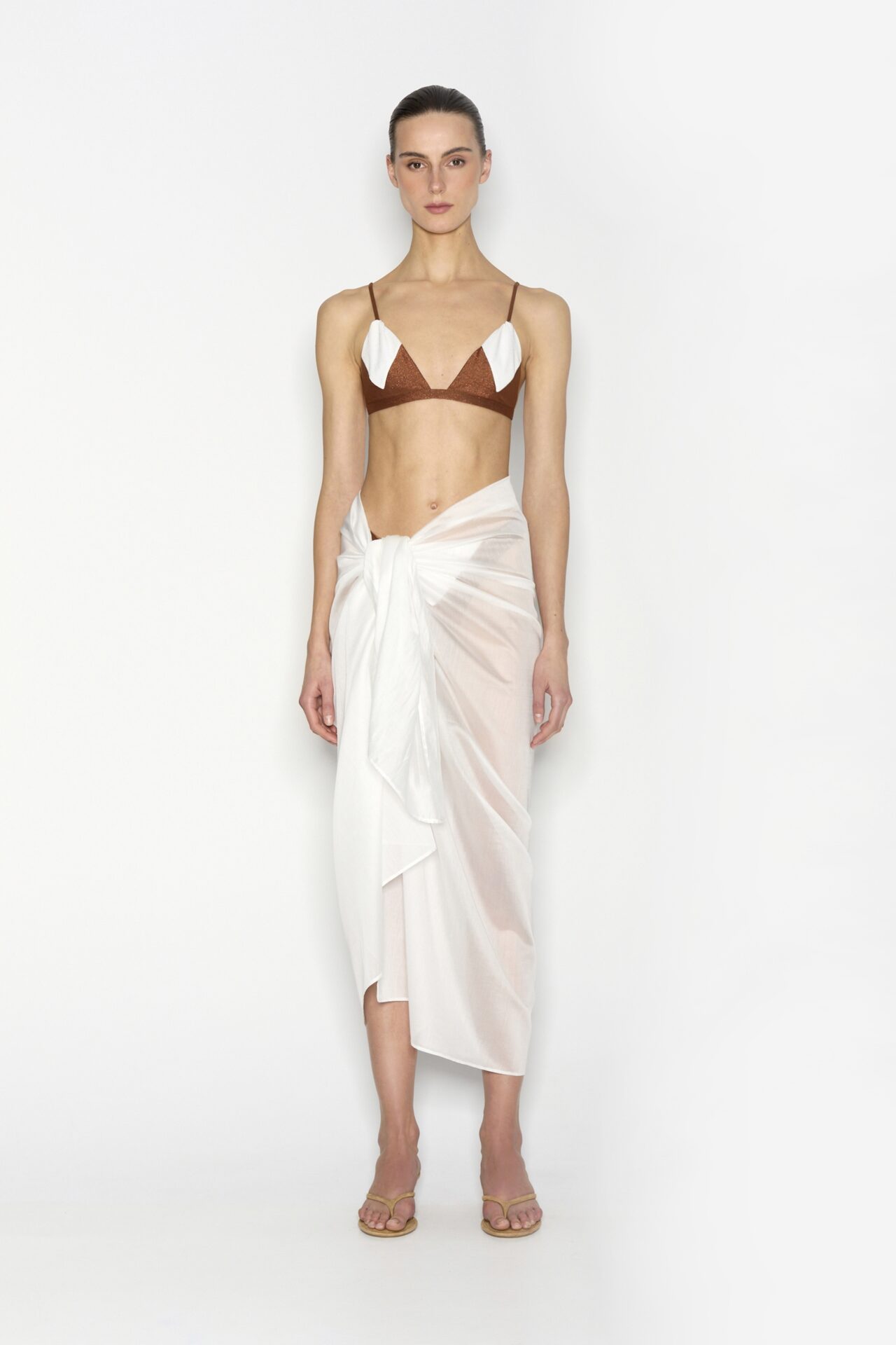 Modern and bold, this bronze and white geometric set features sleek contrast panels and a minimalist triangle top with slim adjustable straps. The high-leg bottoms sculpt a flattering silhouette with just the right amount of coverage, perfect for those who love clean lines and contemporary edge.