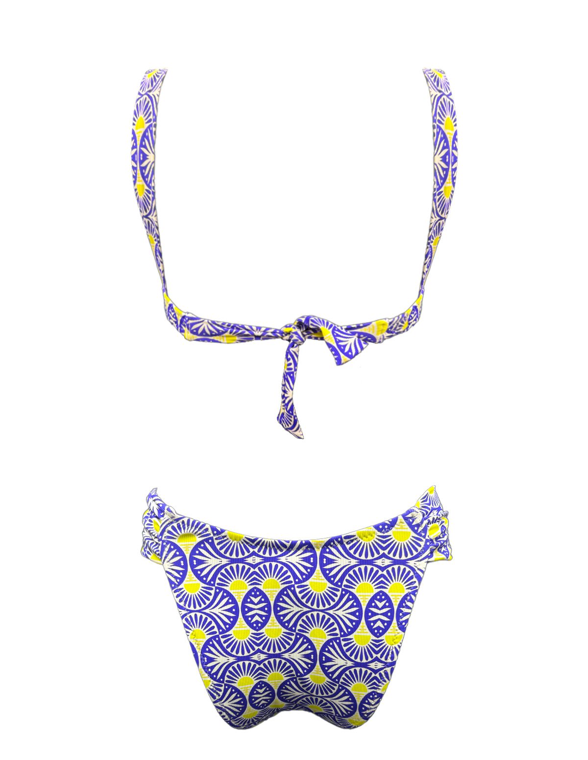 Bikini top with underwire that ties at back and high-rise bikini bottom.