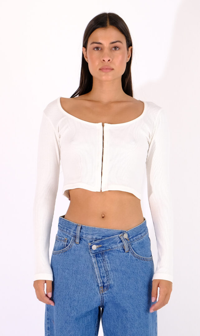 Erica Off-White is a sure suggestion for everyday casual outfits. Sewn in rib fabric and fastens easily from the front with edges. Perfect for all day long. Available in three shades.